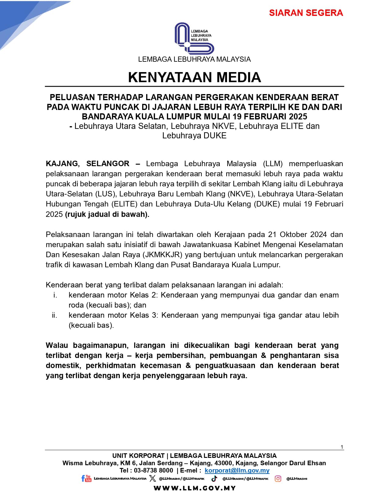 PELUASAN TERHADAP LARANGAN PERGERAKAN KENDERAAN BERAT